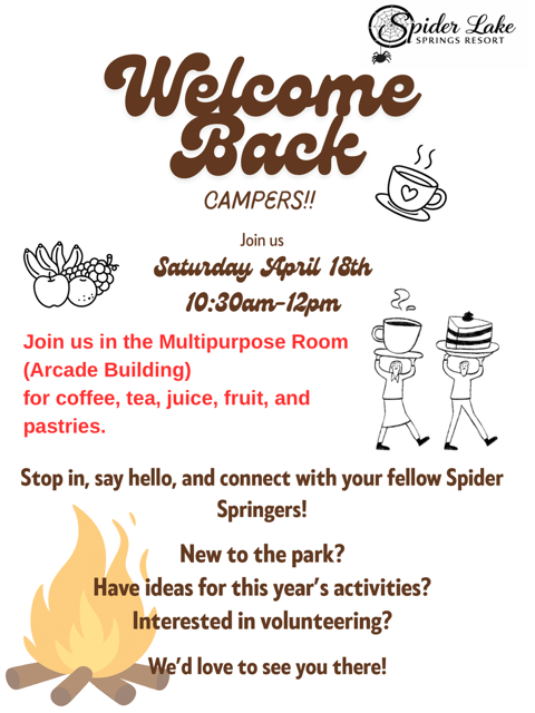 The 2026 Spider Lake Springs Campers Association (SLSCA) and Spider Lake Springs Holding Inc. (SLSHI) AGM will be held Sunday, May 17, 2026, 10:00am in the resort at the Longhouse.